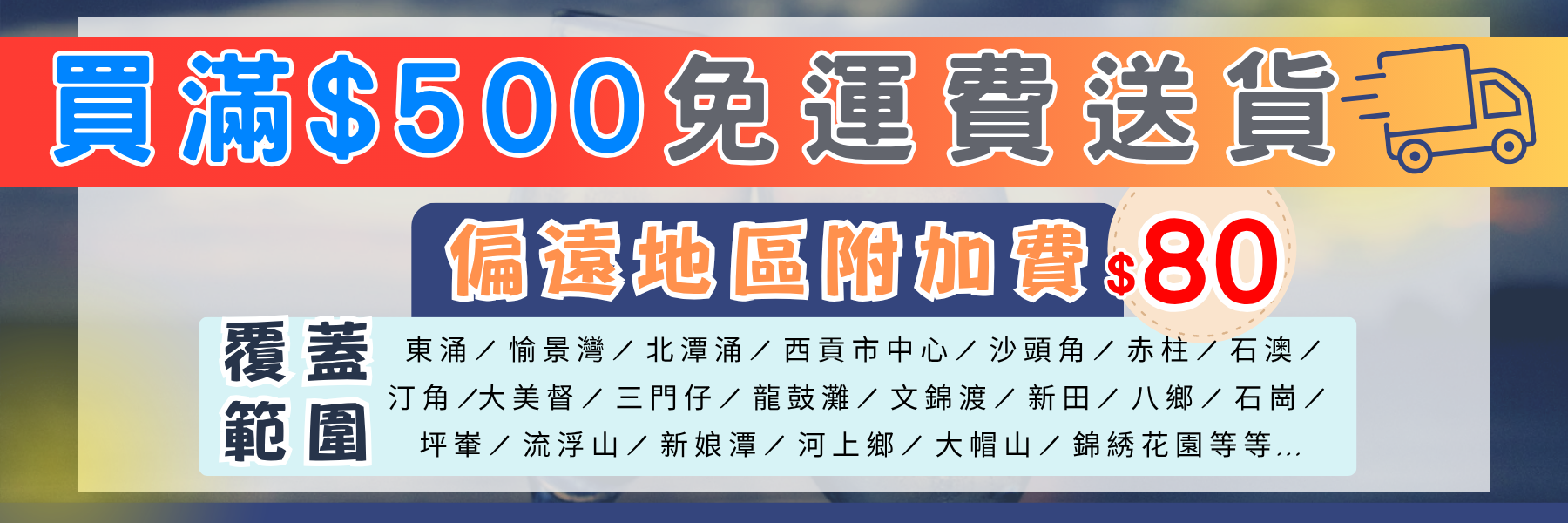 如屬以下派送地址,需另加$80作偏遠附加費: 東涌/ 愉景灣/ 北潭涌/ 西貢市中心/ 沙頭角/ 赤柱/ 石澳/ 汀角/大美督/ 三門仔/ 龍鼓灘/ 文錦渡/ 新田/ 八鄉/ 石崗/ 坪輋/ 流浮山/ 新娘潭/ 河上鄉/ 大帽山/ 錦綉花園等等...